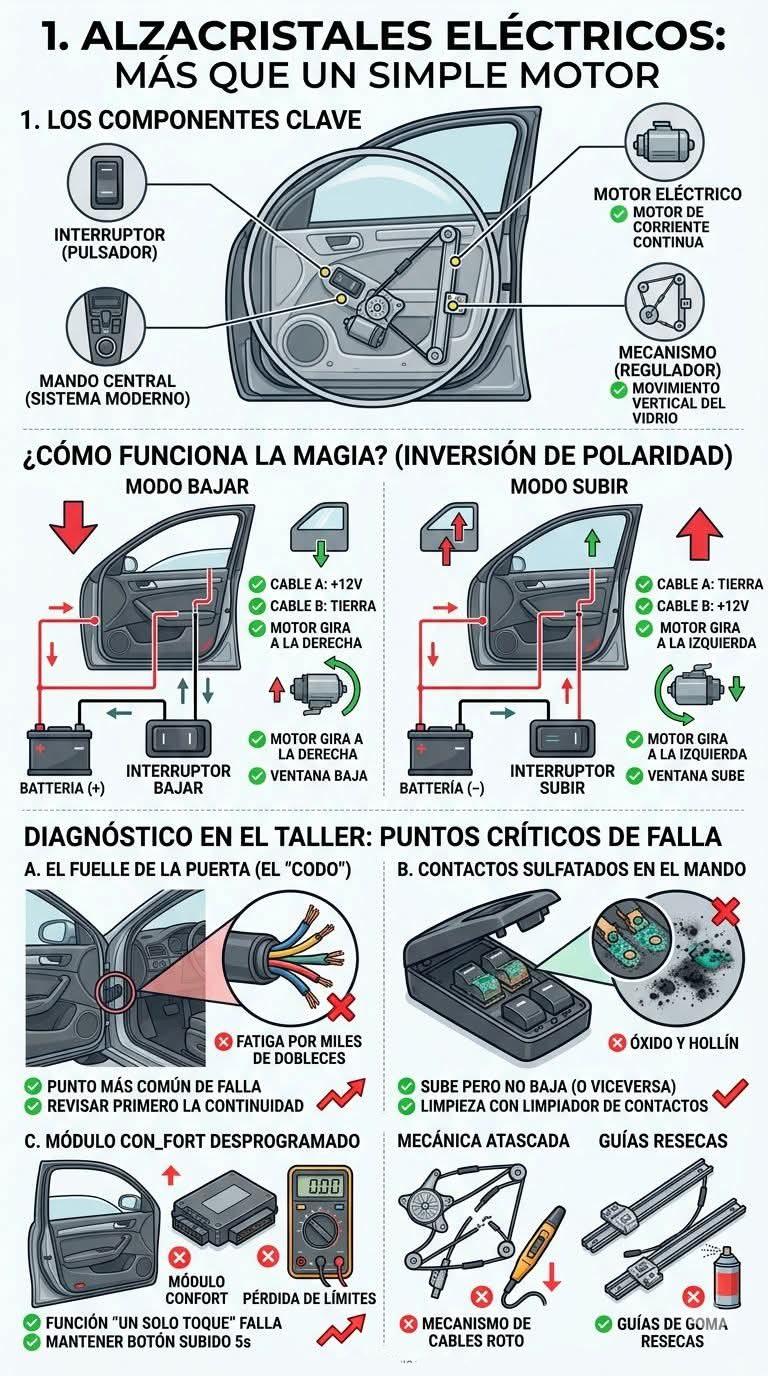 Cuando presionas el interruptor, esperas que el vidrio suba o baje suavemente. Detrás de esa acción simple, hay una coreografía eléctrica y mecánica que a menudo falla en puntos predecibles.