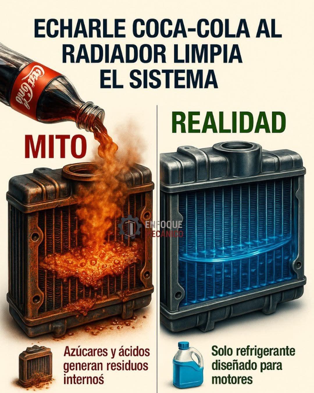 #MitoVsRealidad #SistemaDeEnfriamiento #Radiador #EnfoqueMecánico #TipsMecánicosyMás🚗⚙️ Echarle Coca-Cola al radiador limpia el sistema Algunos conductores creen que, por ser una bebida ácida, la Coca-Cola puede servir para “limpiar” el radiador y eliminar suciedad interna. Esta idea se ha vuelto popular como un truco casero, pero es un mito que ignora cómo está diseñado realmente el sistema de enfriamiento del motor. 🔴 MITO (Usar Coca-Cola limpia el radiador): 1️⃣ Los ácidos disuelven el sarro y la suciedad interna. 2️⃣ Es una solución rápida y barata frente a productos especializados. 3️⃣ Usarla solo una vez no provoca daños al sistema. 🟢 REALIDAD (Lo que realmente sucede): 1️⃣ La Coca-Cola contiene azúcares que, con el calor, se caramelizan y dejan residuos internos. 2️⃣ Estos residuos provocan obstrucciones en el radiador, mangueras y conductos. 3️⃣ Los ácidos generan corrosión en componentes como el radiador y la bomba de agua. 4️⃣ Se reduce la capacidad de enfriamiento y el motor puede recalentarse, causando daños graves. 👉 Consejo profesional: Nunca utilices bebidas gaseosas ni remedios caseros en el sistema de enfriamiento. Si el radiador necesita limpieza, usa productos diseñados para motores y rellena siempre con refrigerante adecuado según el fabricante. El sistema de enfriamiento está diseñado para trabajar con precisión, no con improvisaciones. #MitoVsRealidad #SistemaDeEnfriamiento #Radiador #EnfoqueMecánico #TipsMecánicosyMás0 Comentarios 0 Compartidas 229 Vistas -